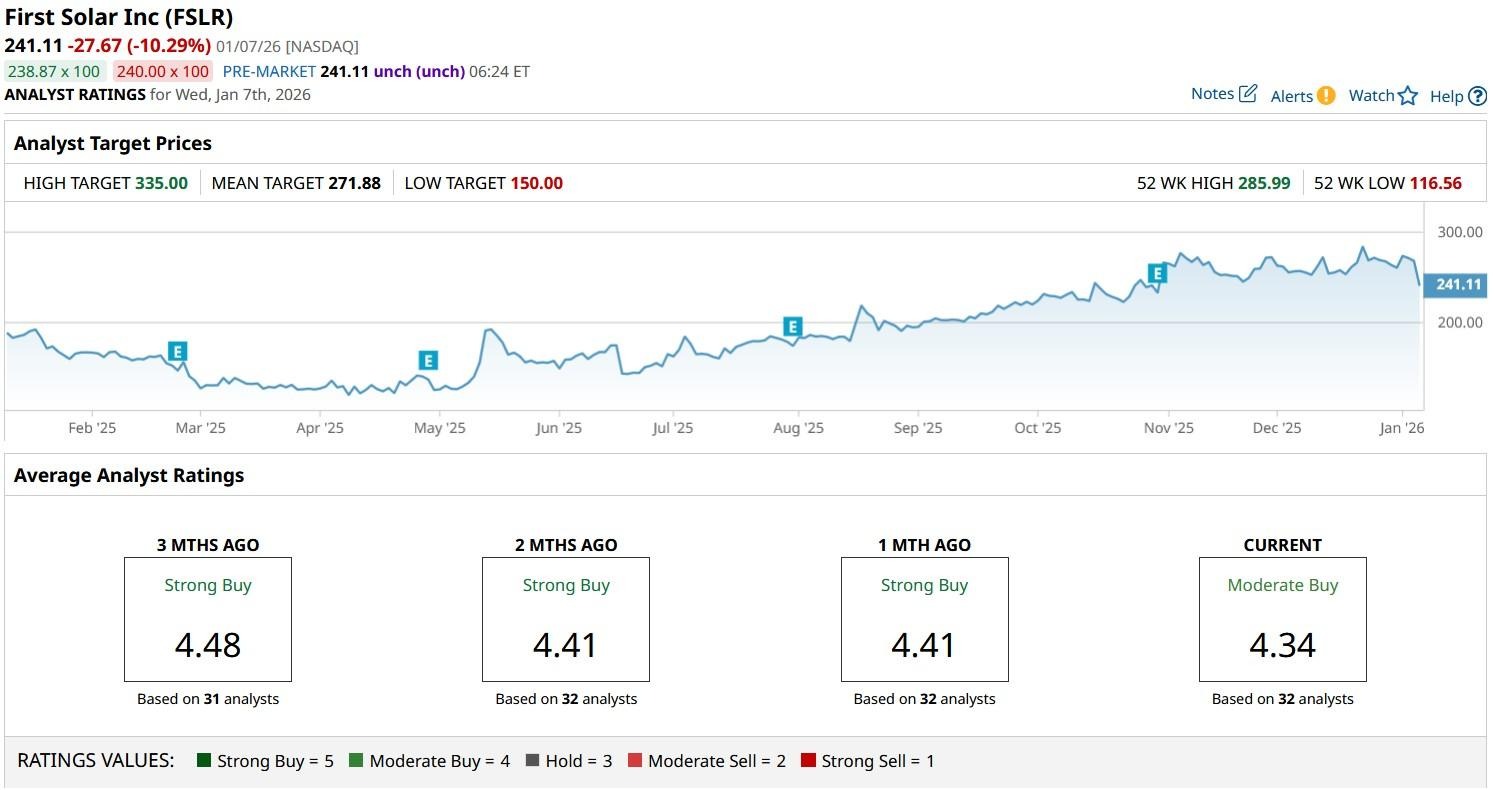 The consensus rating on First Solar shares remains at “Moderate Buy” with the mean target of about $272 indicating potential upside of nearly 13% from here.