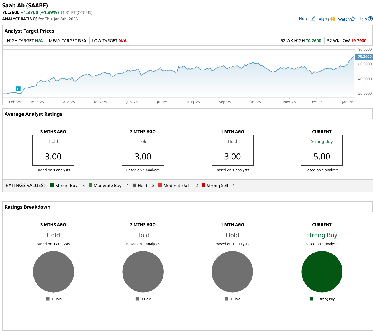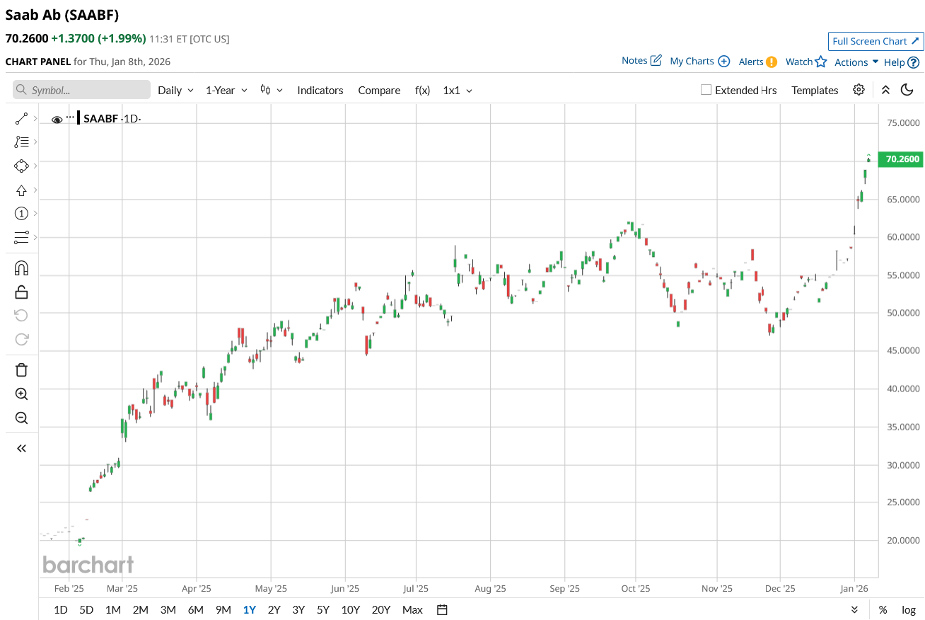 On trading screens, two names stand out as they offer distinctly different exposure to air defense, armor, and ammunition. Saab AB (SAABF) has climbed roughly 33% over the past month, and Rheinmetall (RNMBY) has done even more, jumping about 19% over the same period. Will these two European defense stocks become the preferred way to express this new Arctic‑Caribbean risk theme? Let's take a closer look at these two defense stocks.