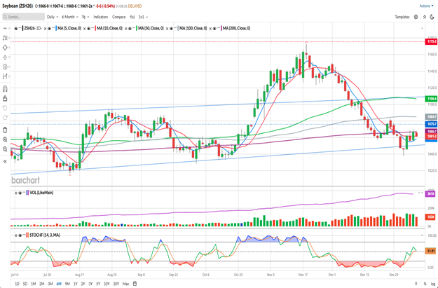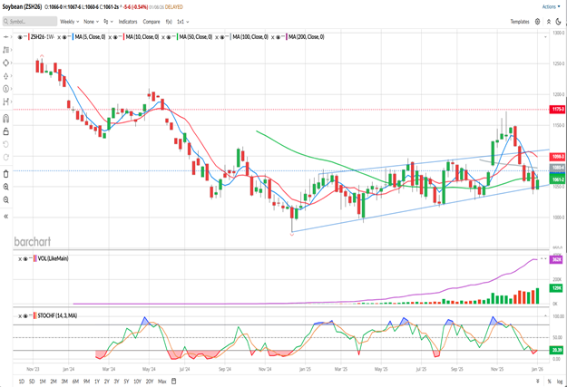 We’re finally getting current information regarding Export Sales and Commitment of Trader data, following the US Government shutdown, so market participants can stop guessing about where we’re actually at. I think that today’s weakness was, in part, due to this morning’s Export Sales being lackluster. In my opinion, it was data from the New Year’s week, when many facilities were short-staffed or closed, so it wouldn’t have been huge anyway. Soybean sales have been weak this year, as China wasn’t buying US Soybeans until relatively recently. By most accounts, they’re allegedly supposed to buy 12 million metric tons from us, and their recent purchases put them somewhere in the 10.5-11.00 mmt range. The are fulfilling their commitments, but most market participants may have been unaware of that, as the Export Sales data was delayed and the data we were getting was incomplete. The strangely ironic thing in my mind is that a rally won’t begin in earnest until their purchases are complete. Doesn’t make any logical sense, but sometimes logic gets tossed out the window when the markets are trading.