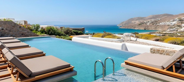 Perched above Kalo Livadi Beach, Mileo Mykonos has 25 boutique suites designed more like homes than showrooms. Guests can enjoy private pools or Jacuzzis, terraces with shade and sea breeze, or a shared infinity-style pool. Wellness is integrated without pressure, featuring an indoor heated pool with hydromassage jets, a sauna, and optional in-suite treatments. In-room tablets handle dining, spa bookings, and messaging, while Apple TV ensures familiar entertainment.