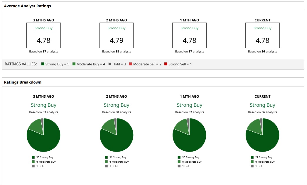 Based on the ratings of 36 analysts, WMT stock is a consensus “Strong Buy.” While 29 analysts assign a “Strong Buy” rating to WMT, six analysts have a “Moderate Buy” rating, and one analyst has a “Hold” rating.