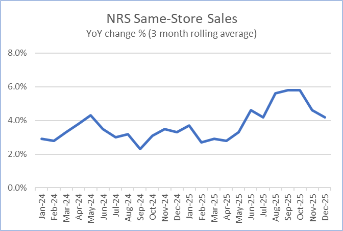 Same-store data comparisons of December 2025 with December 2024 are derived from approximately 217 million transactions processed through the approximately 24,300 stores on the NRS network that scanned transactions in both months. Same-store data comparisons of December 2025 with November 2025 are derived from approximately 266 million transactions processed through approximately 32,200 stores.