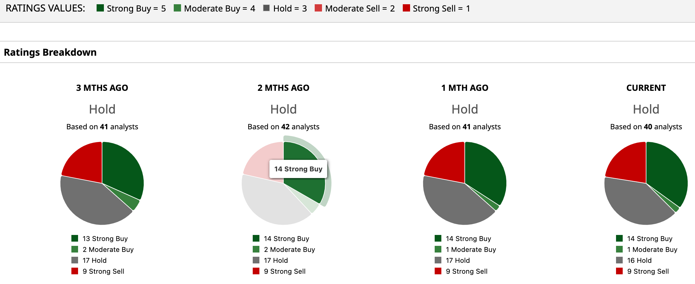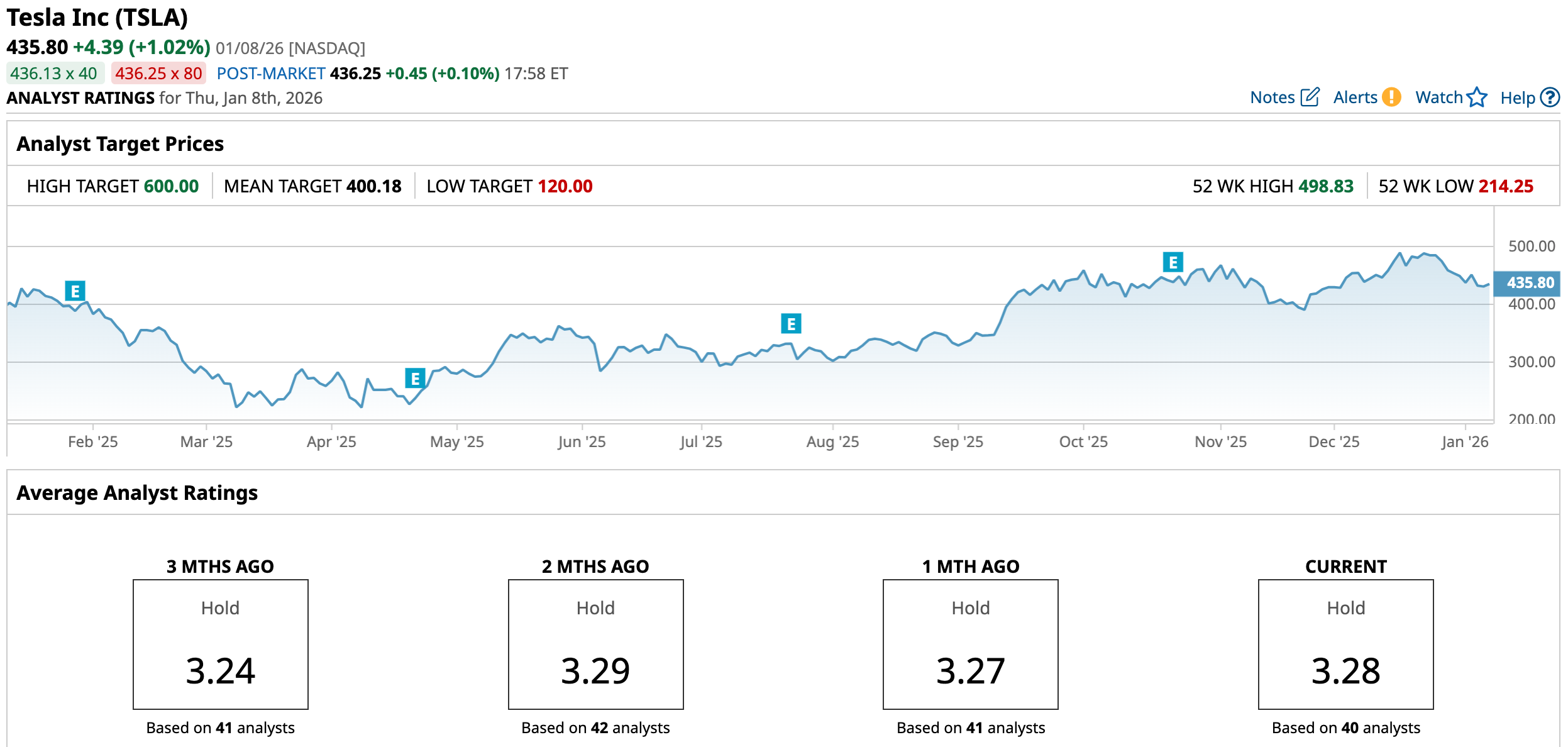 Analysts remain sharply divided on Tesla. The stock has a “Hold” rating overall. Of the 40 analysts covering the stock, 14 recommend a “Strong Buy,” one has a “Moderate Buy,” 16 suggest a “Hold,” and the remaining nine have a “Strong Sell” rating. While the EV stock is currently trading above its mean price target of $400.18, Wedbush’s street-high of $600 implies potential upside of 37.68%.