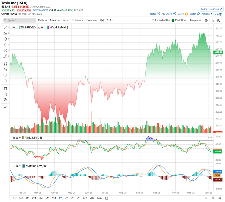 Over the past six months, TSLA rose 46.3%, more than doubling from its April low of $214.25 to a blistering fresh peak of $498.83 on Dec. 22. However, that rally has cooled, with TSLA sliding 13.5% from its peak and stumbling after Nvidia’s autonomy push, leaving shares down 3% in the last five days, signaling a pause. It’s been a distinctly jolting start to 2026.