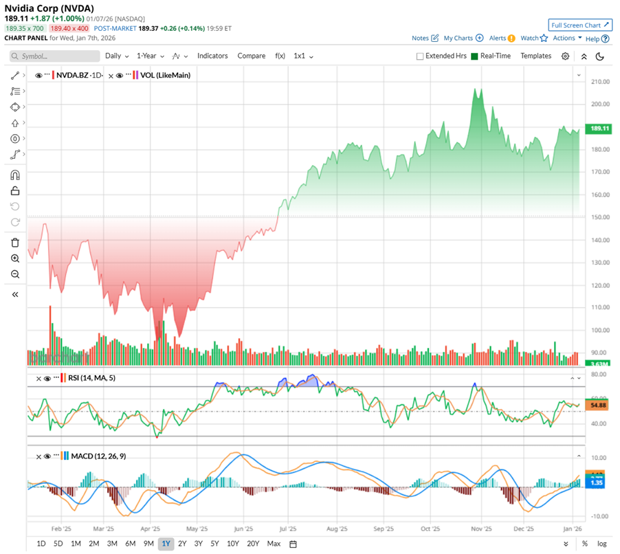 That dominance has carried straight into the stock’s momentum. NVDA has spent the year climbing relentlessly, punctuated by brief pauses rather than true breakdowns. After peaking at $212.19 in late October, the stock cooled by about 11%, a healthy reset rather than a trend shift. Even with that pullback, the bigger picture remains firmly intact, with shares up 32% over the past 52 weeks and nearly 15.65% in just six months, reflecting investors who remain confident in Nvidia’s long-term AI narrative, even as short-term caution creeps in.