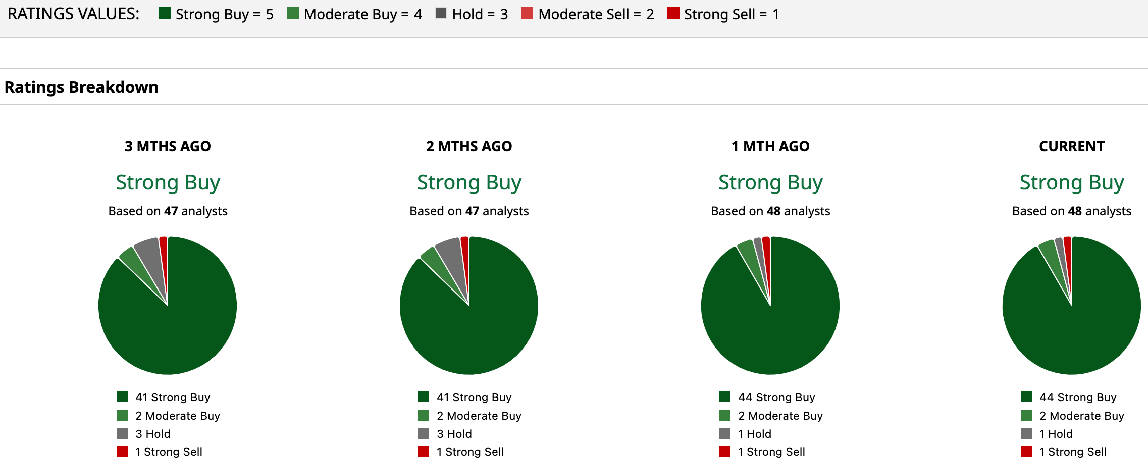 Analysts are bullish about NVDA’s growth prospects, giving the stock a consensus rating of “Strong Buy.” Of the 48 analysts covering the stock, 44 advise a “Strong Buy,” while two suggest “Moderate Buy,” one advises a “Hold,” and only one suggests a “Strong Sell.”