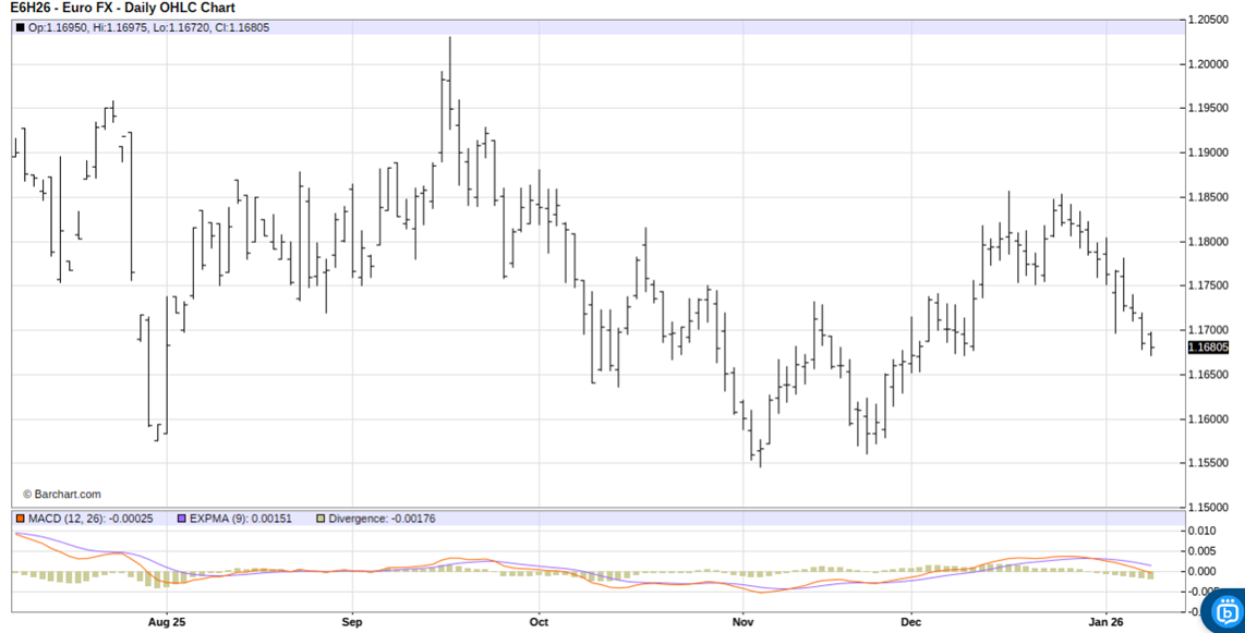 March Euro currency (E6H26) futures present a selling opportunity on more price weakness.