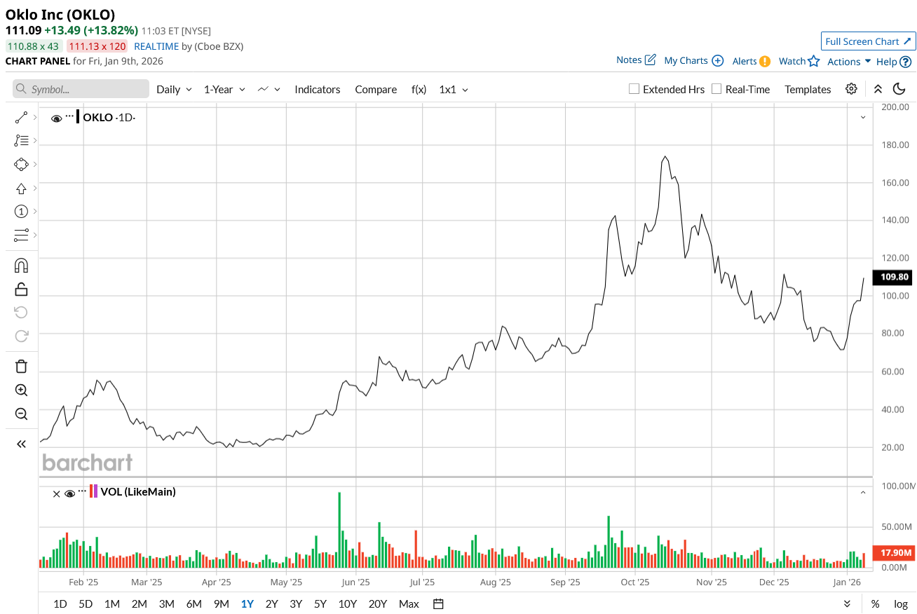 In 2025, Oklo's stock surged 238%, vastly outperforming the S&P 500's ($SPX) 16% gain, though it peaked as high as $193.84 before retreating 47%. So far in 2026, shares are up 56%, compared to the S&P's modest 1% rise.