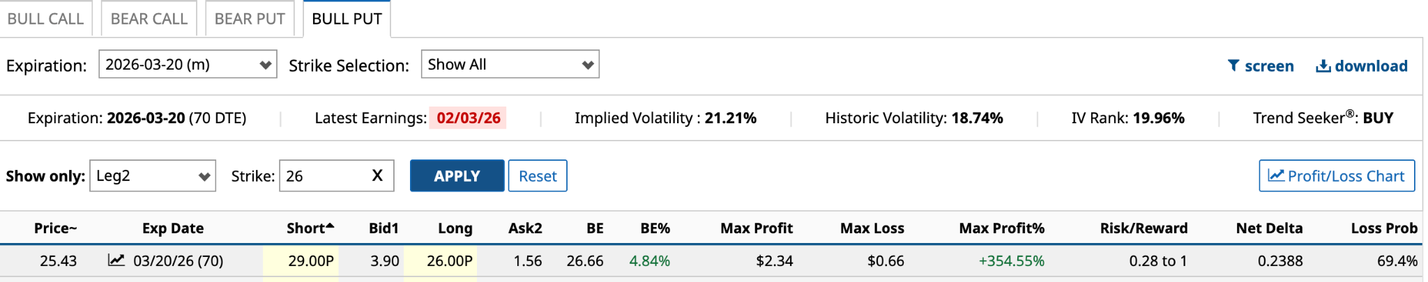 The second of two strategies, the bull put spread, is bullish and expects the share price to move higher. It involves selling a put option (in this case, the $29 put) and buying a put at a lower strike price of $26.