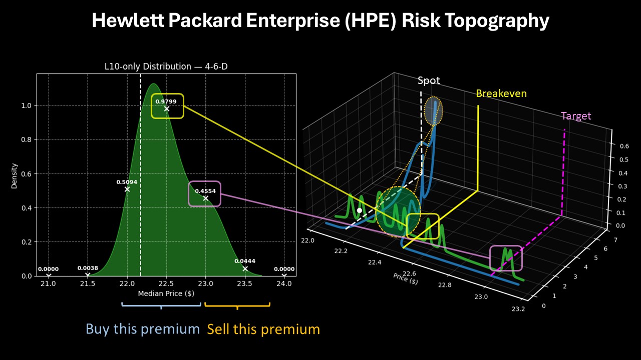 From a hierarchical perspective, a random 10-week position held in HPE stock would likely land somewhere between $22.15 and $22.50 (assuming a spot price of $22.17, Friday’s close). Over many trials, probability density would peak between $22.25 and $22.31.