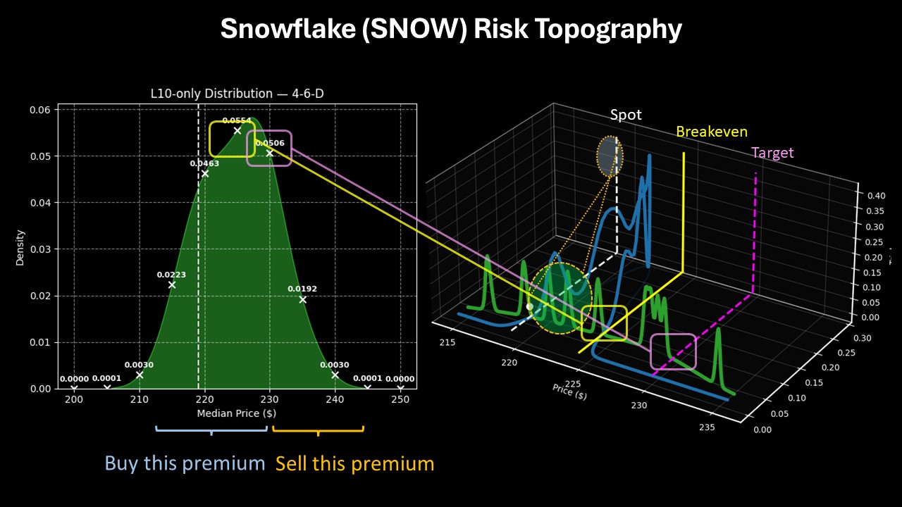 Of course, we’re not looking at trading SNOW stock as an aggregate behavior but specifically for its response to the current quant signal. Right now, SNOW is structured in a 4-6-D formation, which would typically lead to forward 10-week outcomes ranging between $205 and $245. Probability density would likely peak at around $228.