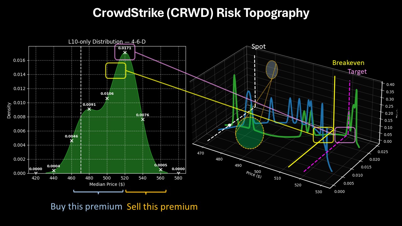 Again, we’re not interested in trading CRWD stock as an aggregate behavior. Instead, we’re looking strictly at the current quant signal, which is structured in a 4-6-D formation. Under this setup, the stock’s forward returns would likely range between $430 and $570, with probability density likely to be predominant at $520.