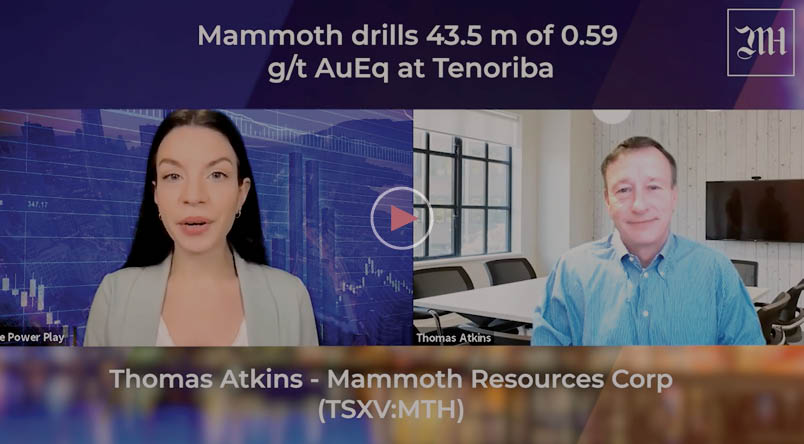 Mammoth (MTH) has provided initial drill results from its Tenoriba Property in Mexico. The drill program is testing a 4 km east-west trend of gold-silver mineralization. Highlights include up to 0.69 g/t gold over 6 m and 75.2 g/t silver over 4.5 m. CEO Thomas Atkins spoke with Caroline Egan about the results. Mammoth Resources is a mineral exploration company focused on acquiring and defining precious metal resources in Mexico and across the Americas.