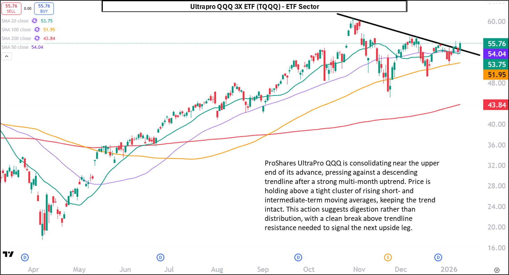 ProShares UltraPro QQQ is consolidating near the upper end of its advance, pressing against a descending trendline after a strong multi-month uptrend. Price is holding above a tight cluster of rising short- and intermediate-term moving averages, keeping the trend intact. This action suggests digestion rather than distribution, with a clean break above trendline resistance needed to signal the next upside leg.