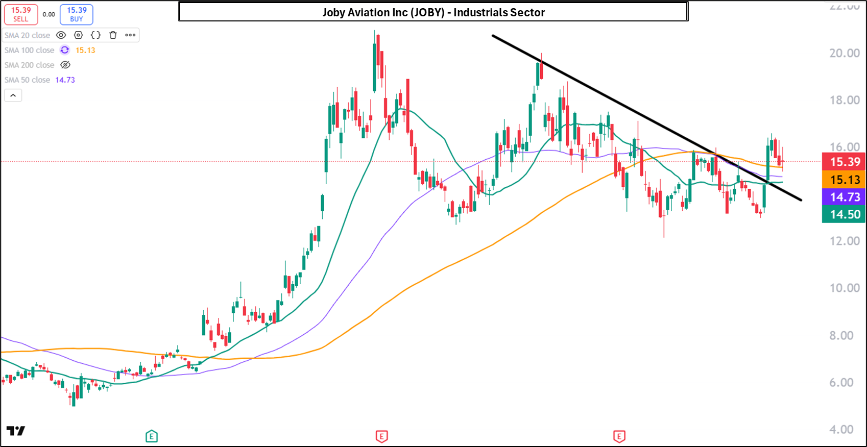 Joby Aviation Inc has broken above the downward-sloping trendline, marking a notable shift in short-term structure. The breakout is being supported by a tight cluster of rising moving averages beneath price, reinforcing the $14.50–$15.00 area as near-term support and improving the technical backdrop as long as this zone holds.