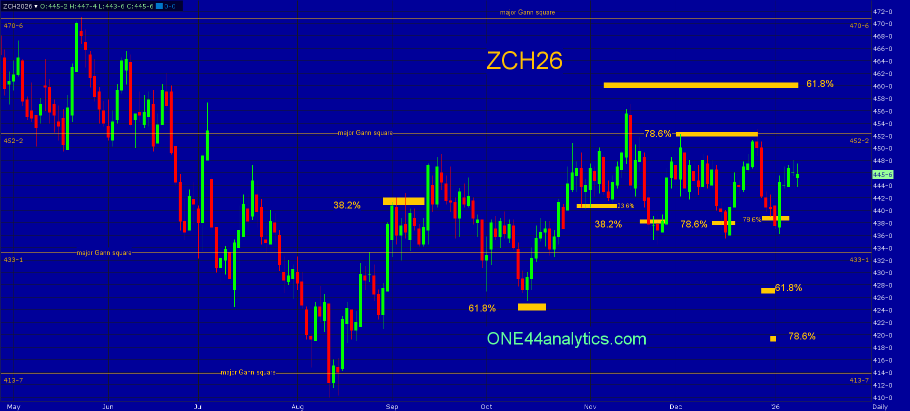 Corn continues to hold the short term swing point keeping the idea of a new high possible, this level is 38.2% of the 8/12/25 low and 11/14/25 high at 438.00. Since it hit this support on 11/20/25 it has been trading between 78.6% retracements. On 12/2/25 it was 452.25, which was also a major Gann square. Then on 12/16/25 it was 438.00, the rally from there hit 78.6% again at 452.25 and the setback from this hit 78.6% at 439.00 on 1/2/26. These are typical moves when following the ONE44 78.6% rule.Â