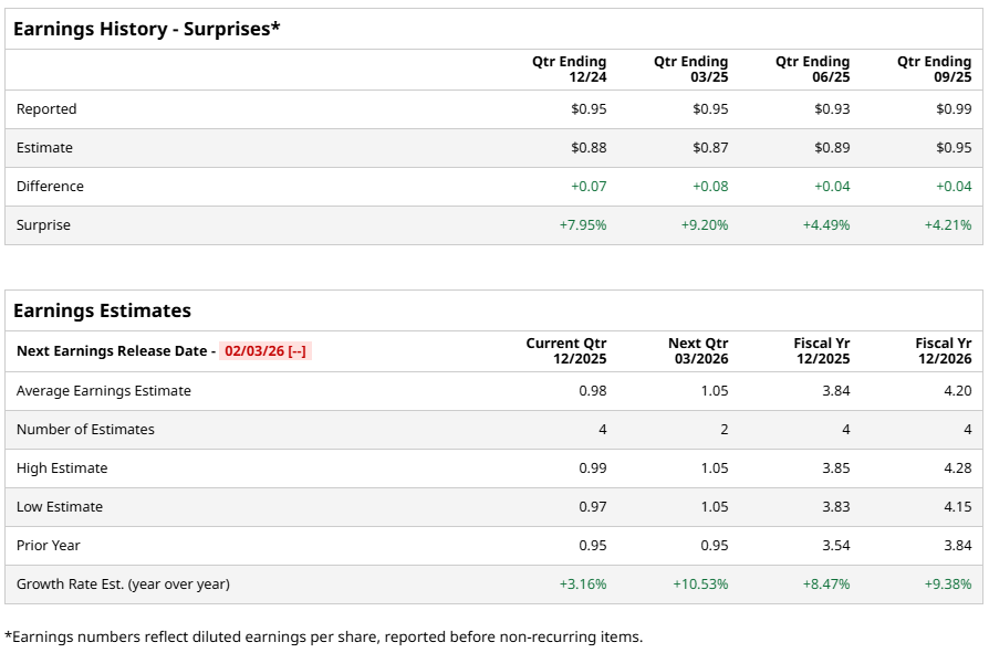 As the company approaches its fiscal 2025 fourth-quarter earnings release, expectations remain encouraging. Analysts project diluted EPS of $0.98, representing 3.2% growth from $0.95 a year earlier. The outlook builds on credibility, as Veralto has exceeded EPS estimates in each of the past four quarters.