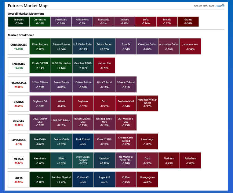 Morning Summary: As I watched financial news early Tuesday morning, there was something missing. Day after day there has been something dramatic attached to – well, you know who. But as the initial talking points were unveiled, it wasn’t there. The US hadn’t done anything (fill in the blank with your own word) overnight, which is unusual, turning the discussion to actual market goings on. The host (Steve Sedgewick of CNBC’s Squawk Box Europe) then talked about how gold and silver continue to skyrocket, the former posting its highest close on record Monday afternoon while the latter continues to climb to record highs nearly every day. (For the record, Feb gold closed Monday at $4,614.70 while March silver posted a high of $86.34 to open the week.) The common theme of talking heads is that this is safe-haven buying tied to the concern over the independence of the US Federal Reserve given this past weekend’s developments. Mr. Sedgewick then made the point that no other sector of the market is indicating concern as equity markets continue to hit new highs as well. Given this, it could be argued the Metals sector is wrong and Equities are right; Equities are right and Metals are wrong; or those saying the rally in Metals is nothing more than safe-haven buying are wrong. If we believe the idea “markets are never wrong”, the answer would be the last choice.
