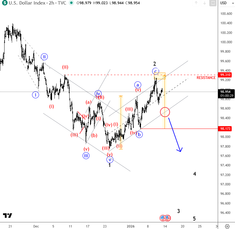 Another important point is the wave pattern on the dollar, which still looks very clear. We have five waves down followed by a three-wave recovery, now at resistance, so it feels like only a matter of time before the corrective channel around 98.50 is taken out. A daily close below that level would likely bring bears back into action and open the door for a drop toward the December 2024 lows.