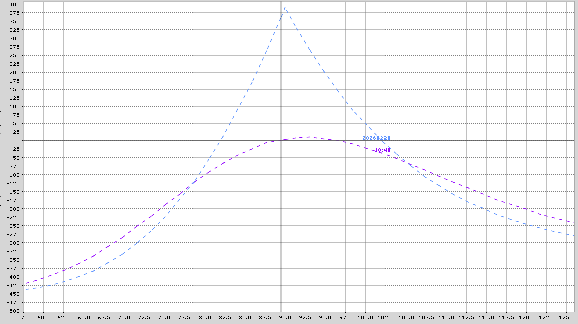 The breakeven prices for the trade are estimated at around $82 and $102 but these can also change slightly depending on changes in implied volatility.