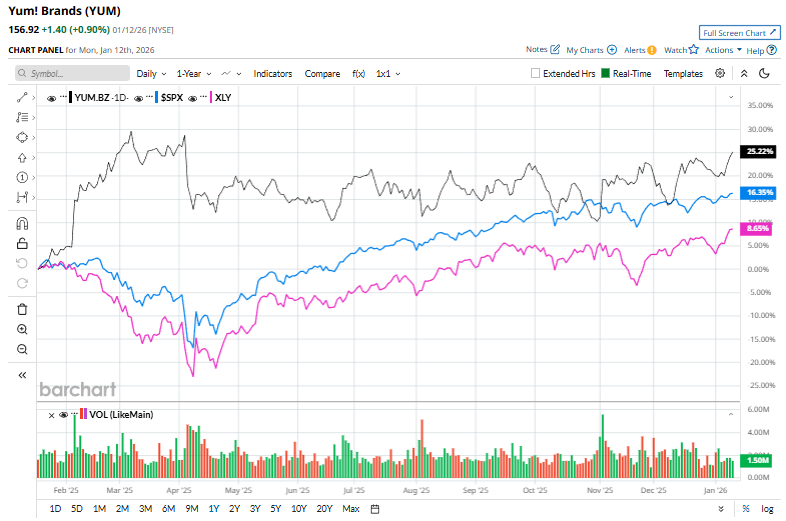 Shares of Yum! Brands have gained 27.3% over the past 52 weeks, outperforming both the S&P 500 Index's ($SPX) 19.7% return and the Consumer Discretionary Select Sector SPDR Fund's (XLY) 12.8% increase over the period.