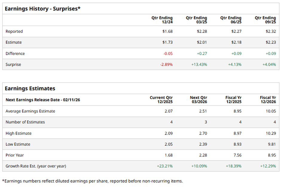 The Pittsburgh, Pennsylvania-based company is set to unveil its fiscal Q4 2025 results soon. Analysts expect WAB to report an adjusted EPS of $2.07, up 23.2% from $1.68 in the year-ago quarter. It has surpassed Wall Street's earnings estimates in three of the last four quarters while missing on another occasion.