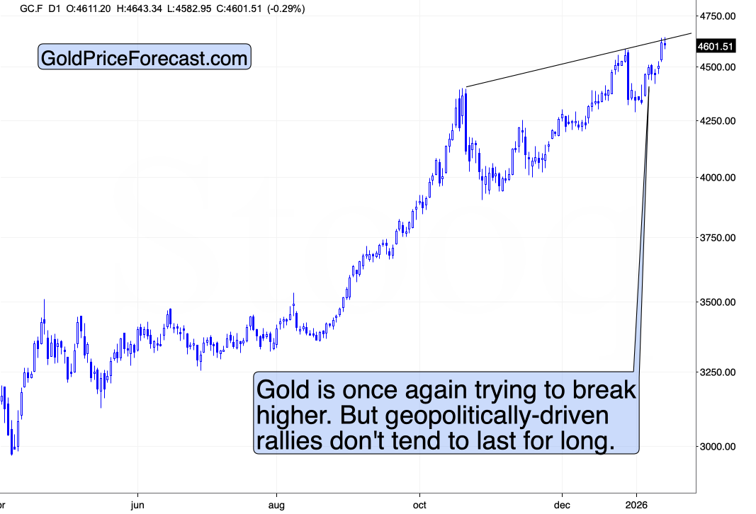 Gold stopped at its resistance line and is now trading around the $4,600 level. This move – just like the move above $4,500 are not confirmed.