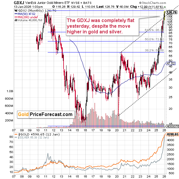 On a side note, if you've been wondering why the GDXJ chart that you can see here (provided by StockCharts.com) shows the top at about $127 while the GDXJ chart provided elsewhere, for example on investing.com shows the top at about $179, here's the explanation:
