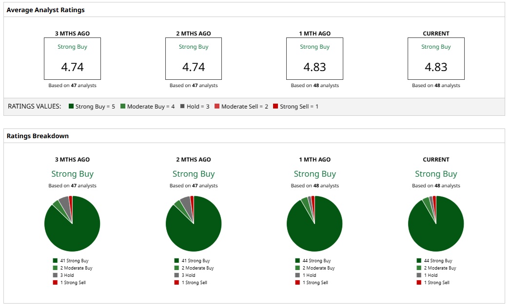 Based on the ratings of 48 analysts, NVDA stock is a consensus “Strong Buy.” An overwhelming majority of 44 analysts assign a “Strong Buy” rating to NVDA. Further, two and one analyst have assigned a “Moderate Buy” and “Hold” rating, respectively. One analyst, however, believes that NVDA stock is a “Strong Sell.”