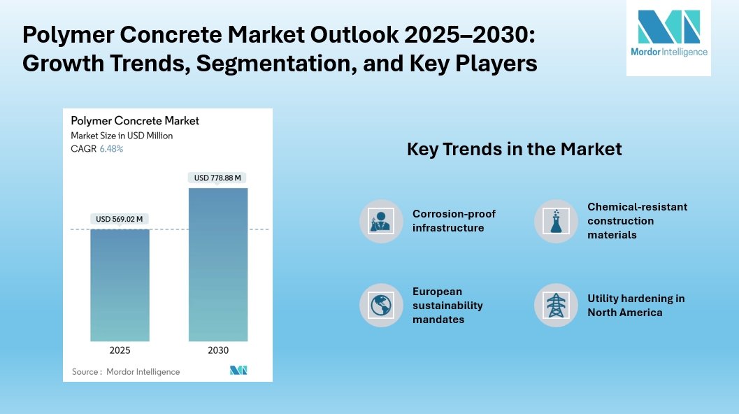 According to Mordor Intelligence, the polymer concrete market size is projected to grow from USD 569.02 million in 2025 to USD 778.88 million by 2030, reflecting a 6.48% CAGR. Polymer concrete, which replaces Portland cement with synthetic or natural resins, offers superior compressive strength, faster curing times, and enhanced resistance to chemicals and environmental stressors.