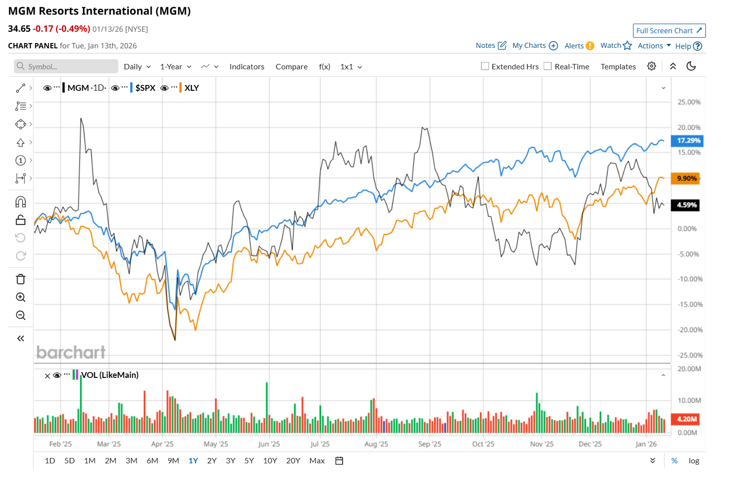MGM has gained 7.2% over the past 52 weeks, underperforming both the S&P 500 Index's ($SPX) 19.3% return and the State Street Consumer Discretionary Select Sector SPDR ETF’s (XLY) 11.9% uptick over the same time period.