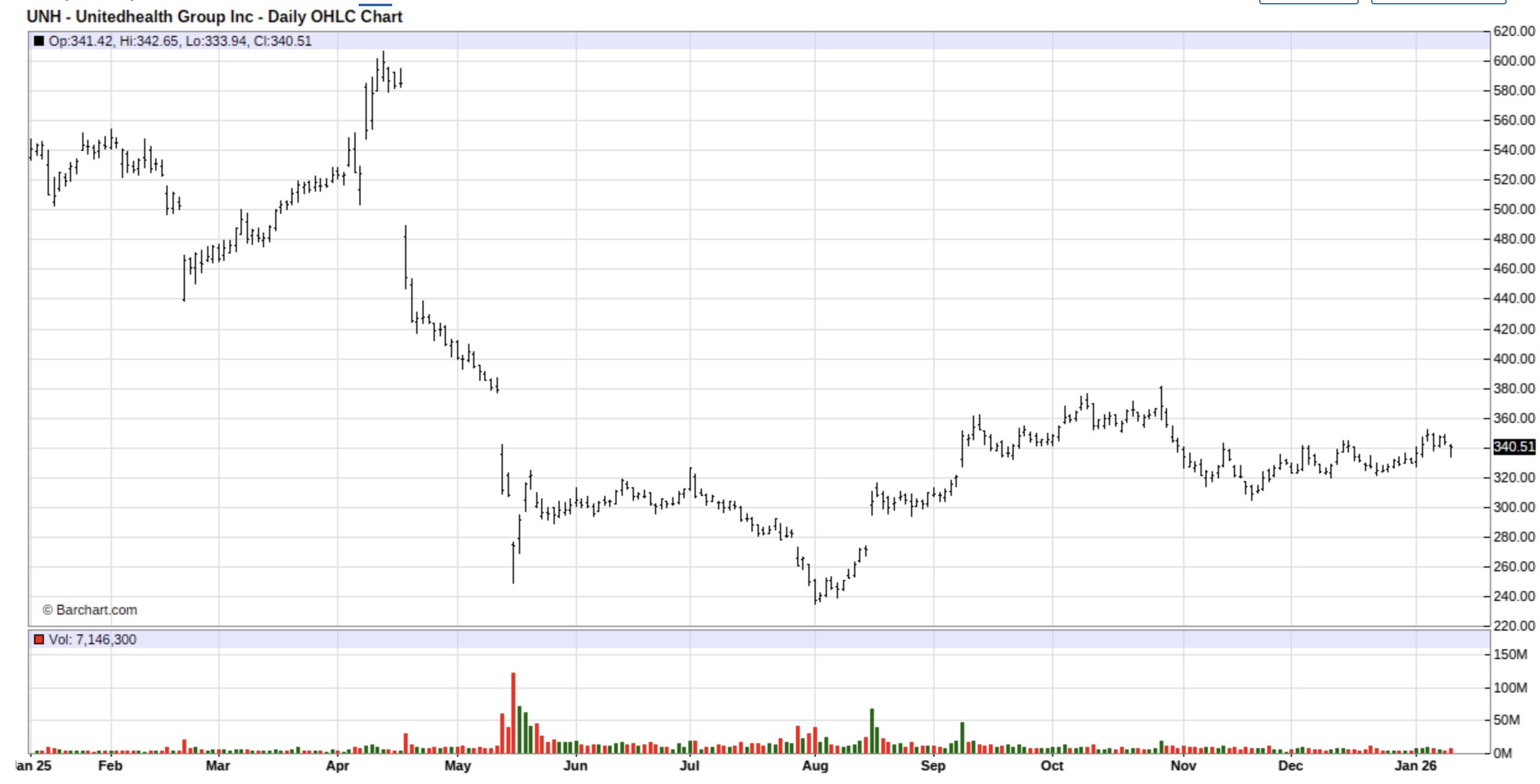 UnitedHealth Group (UNH) was one of the worst-performing large-cap stocks of 2025. For the full year, shares fell roughly 33%.