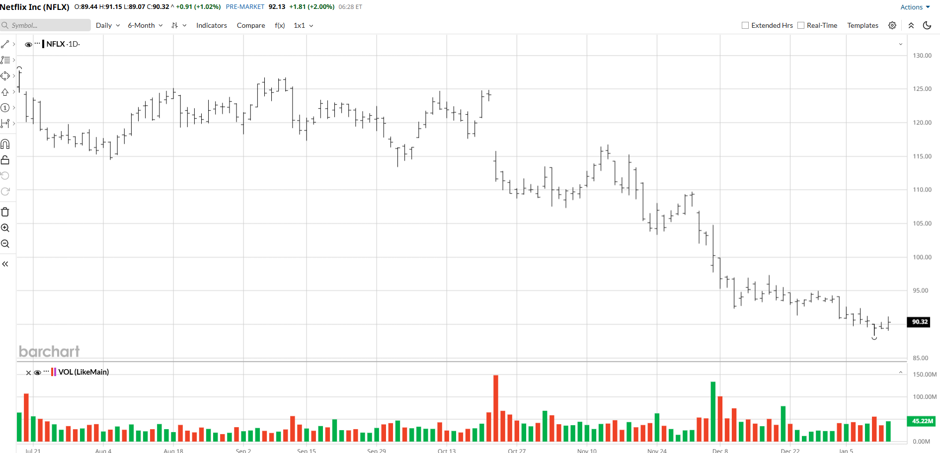 Historically, the shares of firms that make big acquisitions tend to underperform following these deals. That's because the transactions cause their financial positions to deteriorate, while the extent to which the deals will boost the companies' performance over the long term is often difficult to determine. Netflix has not been an exception to this general rule, as its shares sank from around $103 on Dec. 4, the day before the proposed takeover was announced, to $90.32 as of the market close on Jan. 13.