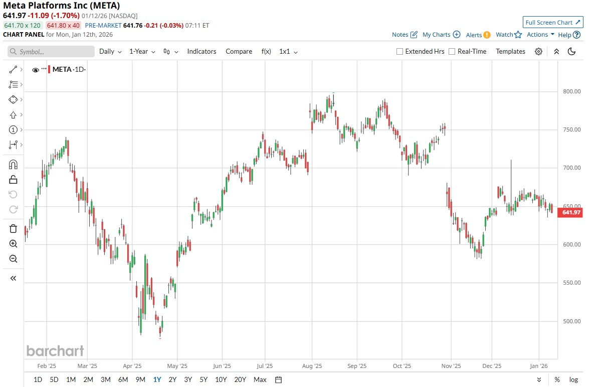 META shares stood at around $616 on Jan. 14, with a year-to-date (YTD) return of -7% but a 52‑week gain of 4%.