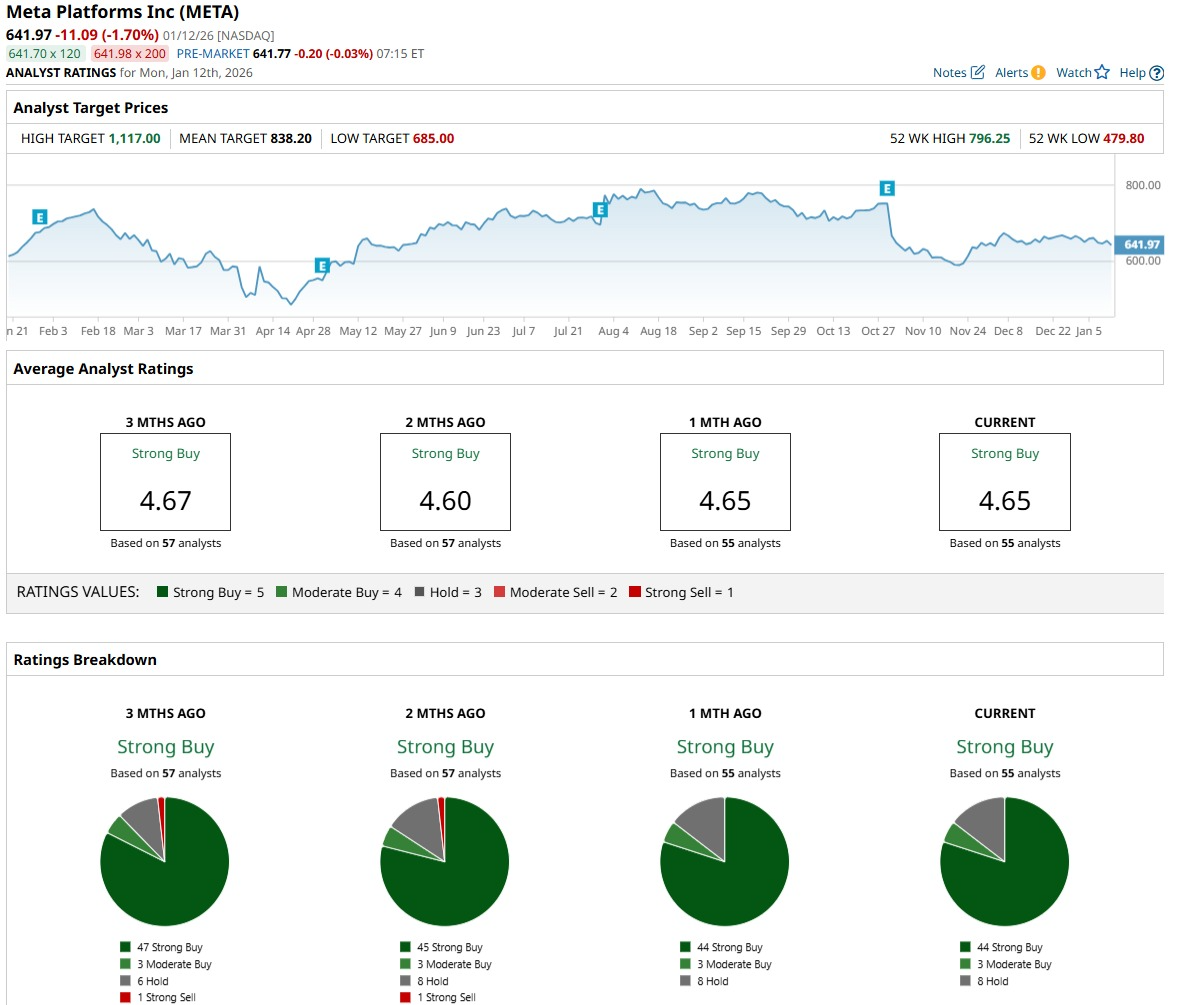 Analyst sentiment is firmly positive. A group of 55 analysts has a consensus rating of “Strong Buy" on META stock. The average price target stands at $838.06, implying potential upside of roughly 36% if projections are met.