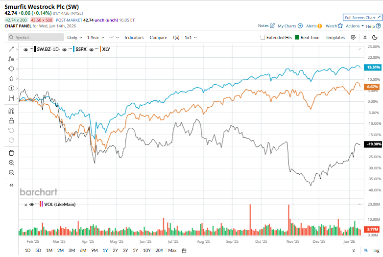 Smurfit Westrock has lagged the broader market over the past year amid a challenging demand backdrop for packaging and containerboard products. Weaker consumer packaging shipments, coupled with persistent headwinds in North American and European corrugated markets, have pressured volumes and margins, prompting the company to pursue cost-rationalization measures and selective asset closures, which have weighed on investor sentiment.