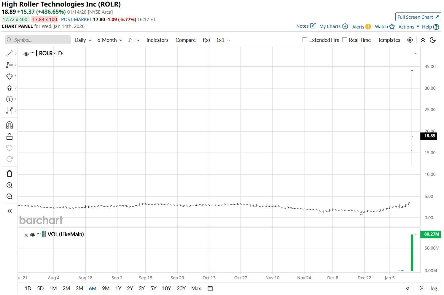 High Roller Technologies (ROLR) shares closed roughly 440% higher on Jan. 14 after the Los Angeles-headquartered firm partnered with Crypto.com to launch event-based prediction markets.
