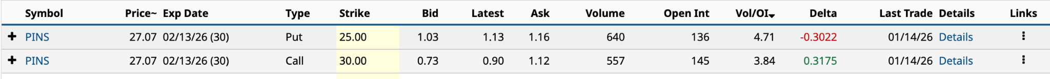 Yesterday, Pinterest had eight unusually active options, but only two are expiring in 30 days, which form a multi-leg trade.