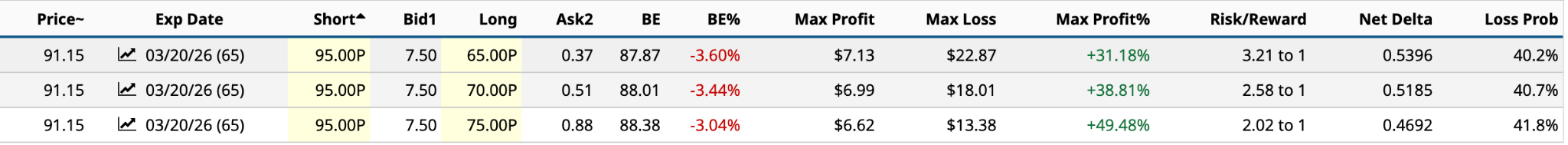 I need at least one more option to complete a multi-leg trade. In this instance, the Bull Put Spread makes sense. A bullish strategy, this involves selling the Feb. 20 $95 put for income and buying a lower-priced put with the same expiration date for downside protection. The possible strike prices appear below.