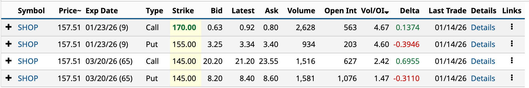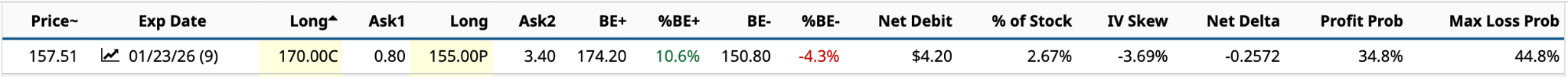 Starting with the Jan. 23 DTE (days to expiration), the $170 call and $155 put form a Long Strangle, which involves buying the $170 call and buying the $155 put. You’re expecting SHOP stock to move significantly in either direction over the next nine days.