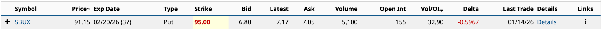 Starbucks (SBUX) had only one unusually active option yesterday, but its Vol/OI ratio of 32.90 was the 20th-highest on Wednesday, with decent volume of 5,100.