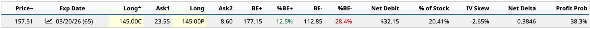 In this example, you’re looking at a Long Straddle, where the strike price for the call and put is the same. Because the $145 call is deep ITM, the net debit is 20.41% of the stock price at $3,215.