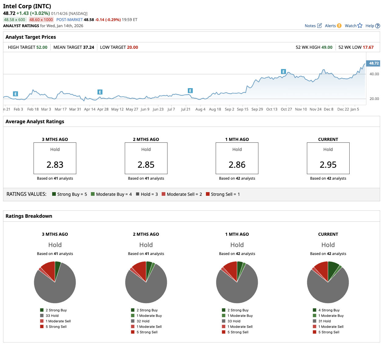 Out of the 42 analysts covering Intel stock, four recommend “Strong Buy,” one recommends “Moderate Buy,” 31 recommend “Hold,” one recommends “Moderate Sell,” and five recommend “Strong Sell.” The average INTC stock price target is $37.24, below the current price of $49.