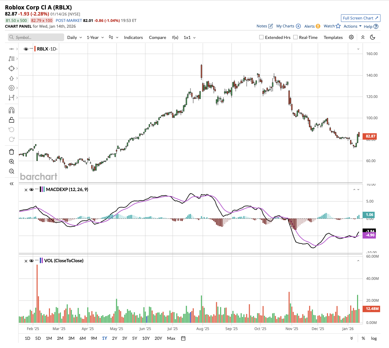 Valued at a market cap of $58 billion, Roblox operates a user-generated gaming platform that has gained significant traction among younger demographics. With millions of daily active users, RBLX stock has surged 33% in the past year but also trades 45% below all-time highs.