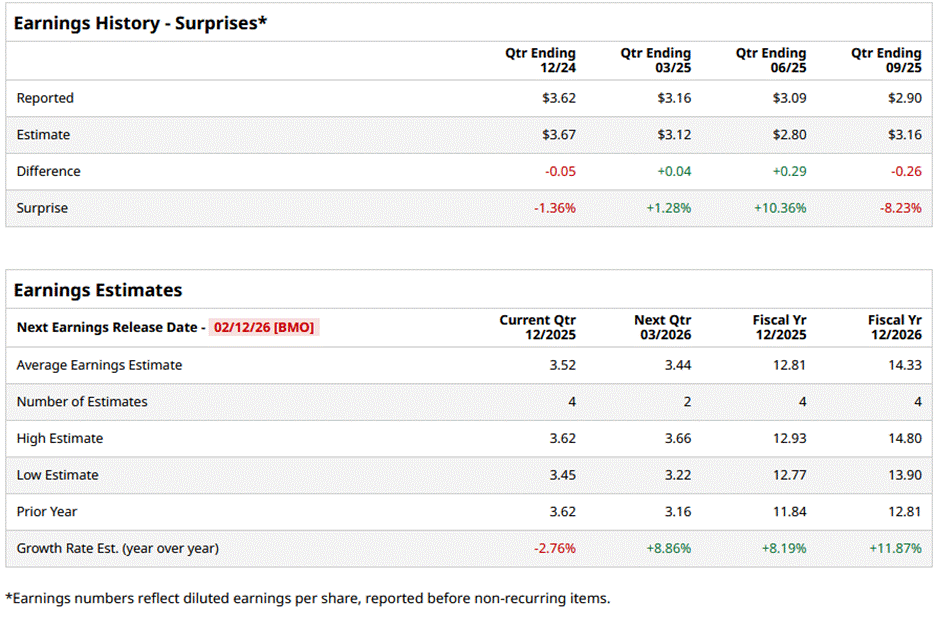 For the current year, analysts project the company’s EPS to be $12.81, up 8.2% from $11.84 in fiscal 2024. Moreover, its EPS is expected to rise by roughly 11.9% year over year (YoY) to $14.33 in fiscal 2026.