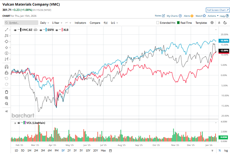 VMC stock has gained 12.5% over the past year, trailing the S&P 500 Index’s ($SPX) 16.3% gains but matching the Materials Select Sector SPDR Fund’s (XLB) 12.5% surge over the same time frame.