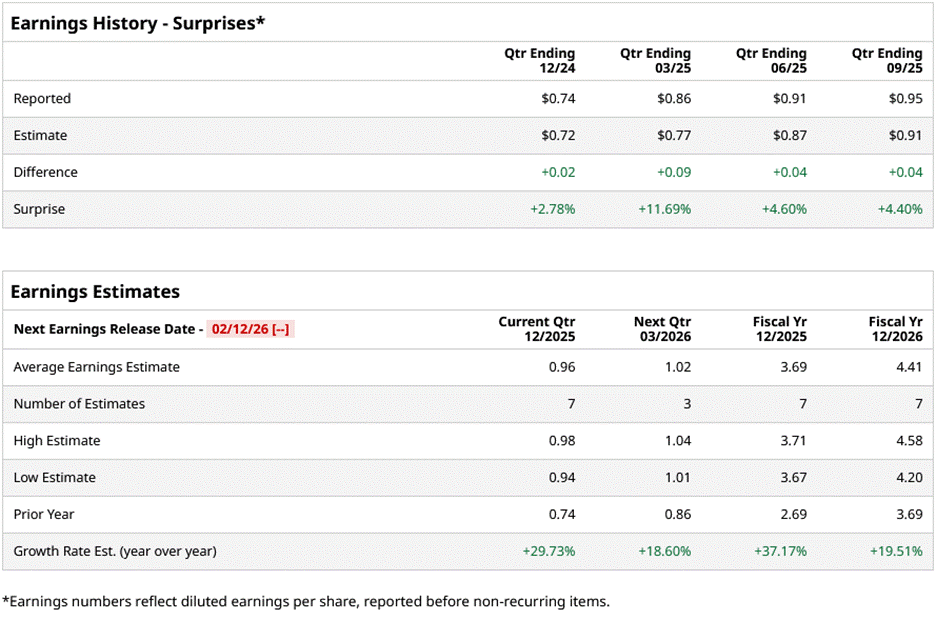 Founded in 1888, Pittsburgh, Pennsylvania-based Howmet Aerospace Inc. (HWM) provides advanced engineered solutions for the aerospace and transportation industries in the United States and internationally. The company has a market capitalization of $88.6 billion and is expected to release its Q4 2025 earnings report on Thursday, Feb. 12.