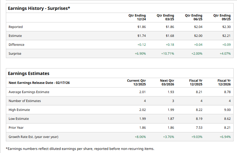 The security company is expected to announce its fiscal Q4 earnings for 2025 in the near future. Before this event, analysts expect ALLE to report a profit of $2.01 per share, up 8.1% from $1.86 per share in the year-ago quarter. The company has a solid trajectory of consistently beating Wall Street’s bottom-line estimates in each of the last four quarters.