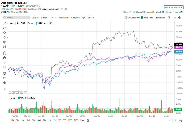 Allegion has rallied 24.9% over the past 52 weeks, outpacing both the S&P 500 Index's ($SPX) 16.7% uptick and the Industrial Select Sector SPDR Fund’s (XLI) 22.5% return over the same time frame.
