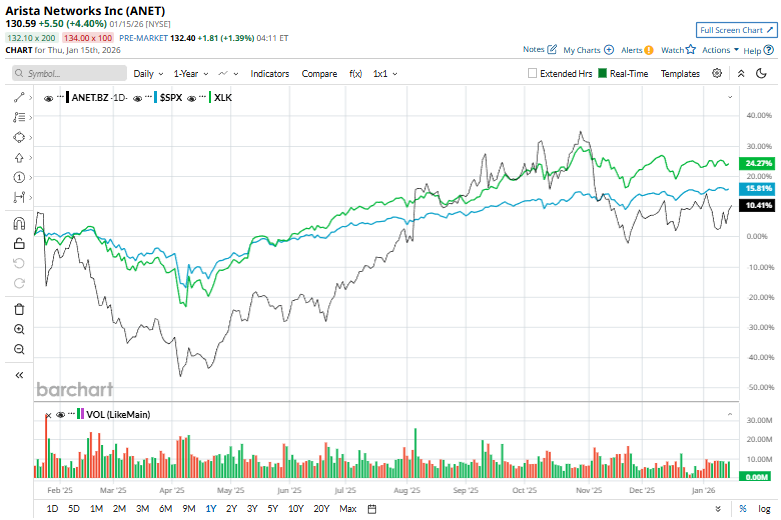 ANET stock has gained 12.5% over the past year, outpacing the S&P 500 Index’s ($SPX) 16.7% gains and the Technology Select Sector SPDR Fund’s (XLK) 23.2% rise over the same time frame.